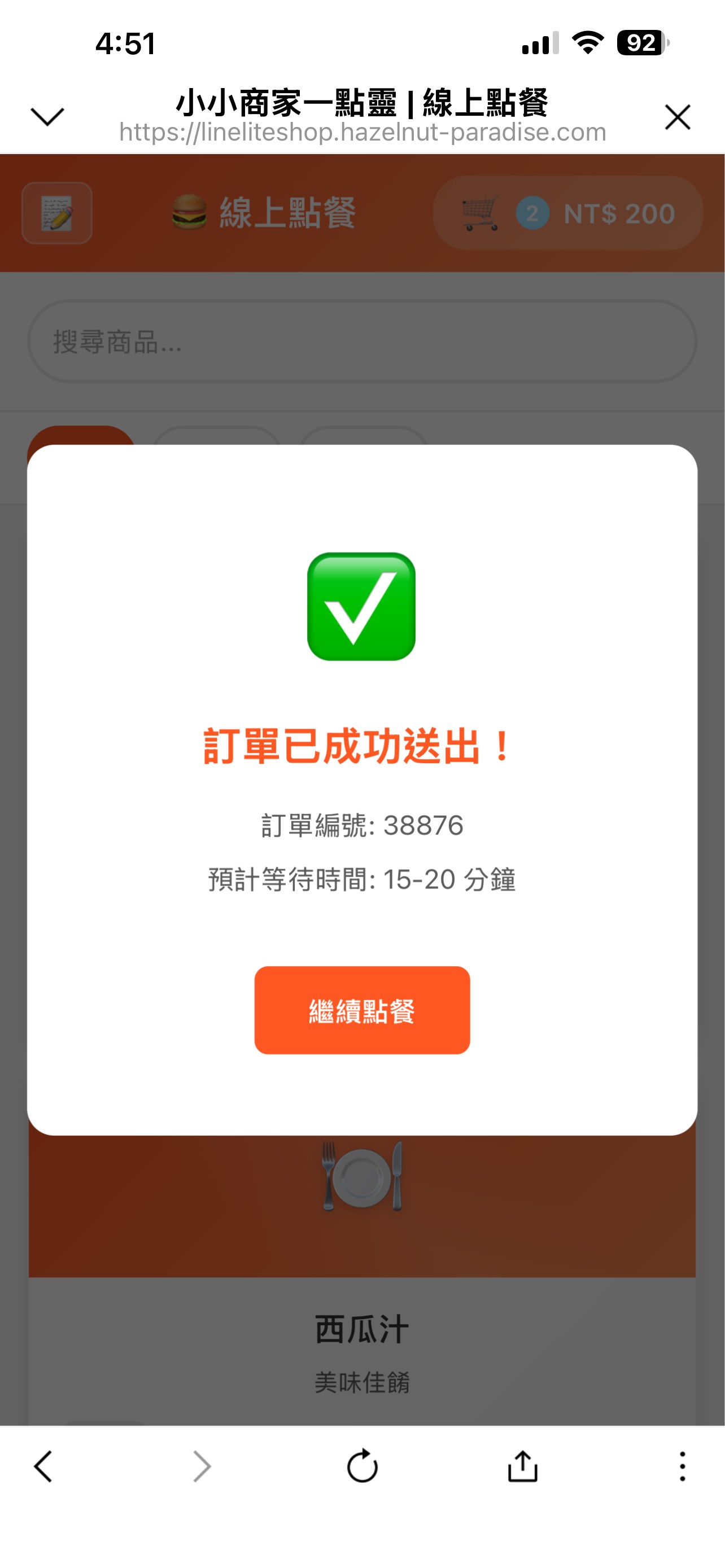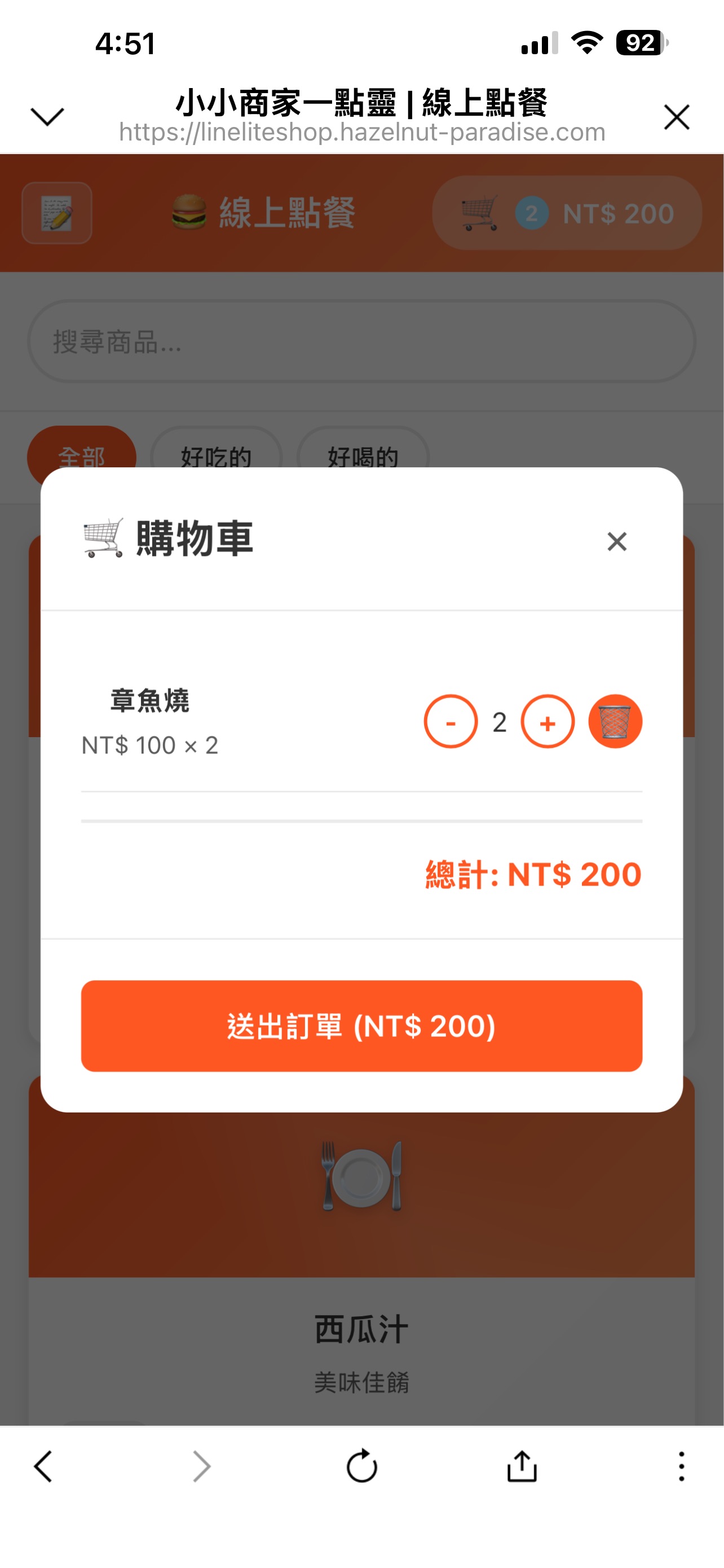登入完成之後,可以進入點餐介面,這裡顯示商家提供的所有商品、庫存、價格,也可以按分類檢視。