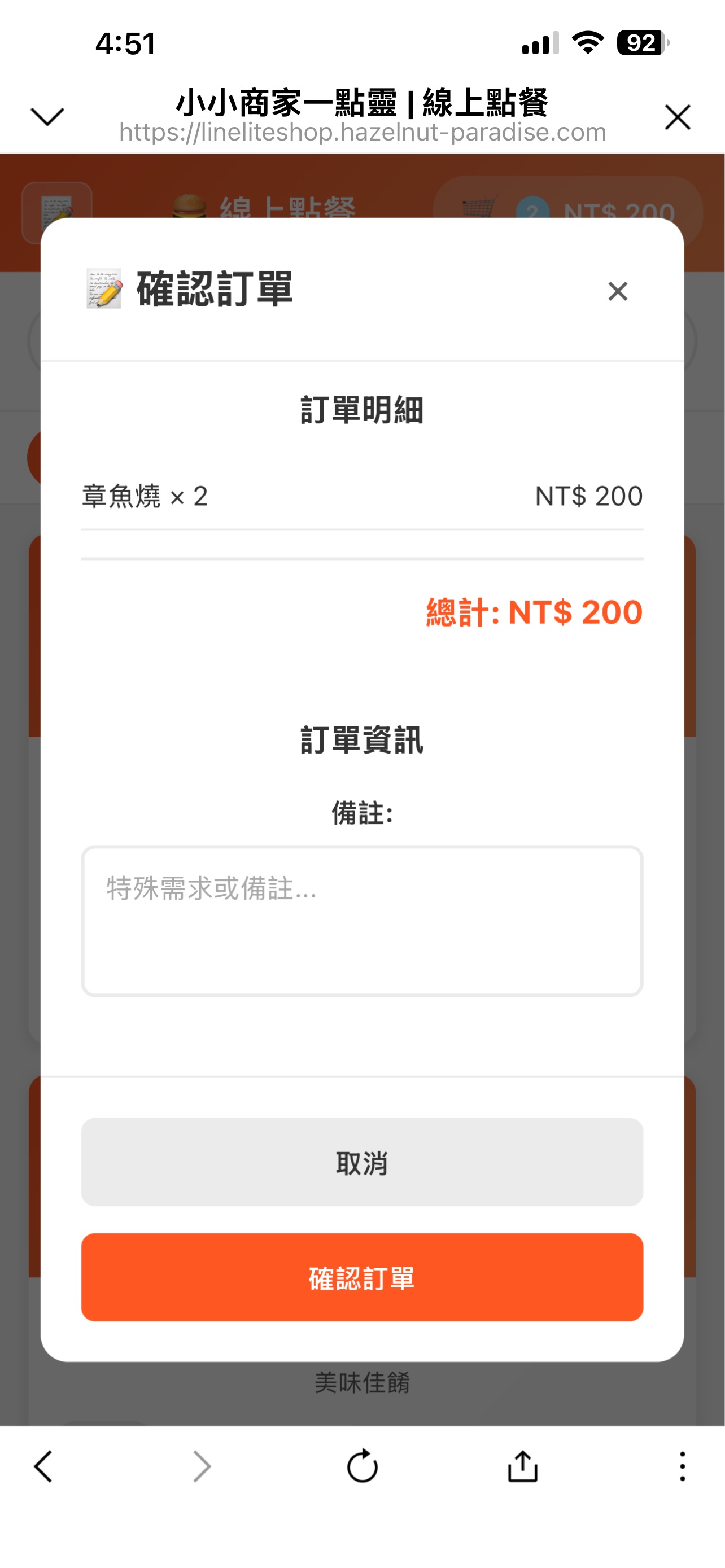 送出訂單時會再最後確認,並且可以新增備註,例如不加香菜、不要加辣等等。